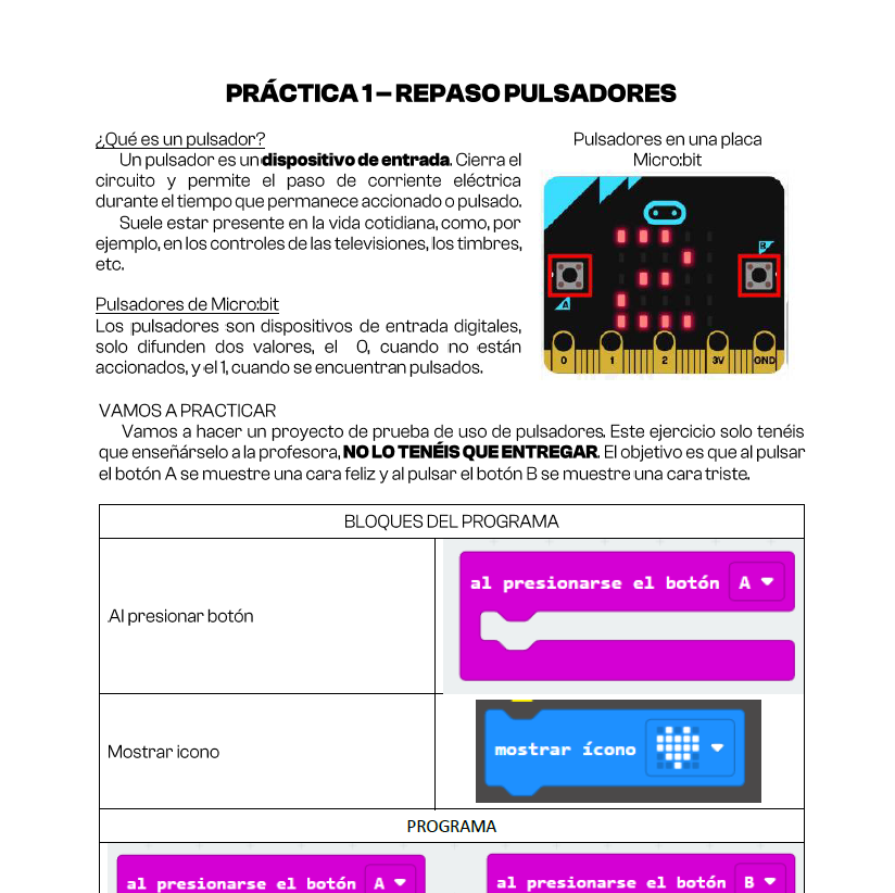 2️⃣ Crear un programa: Se arrastran y colocan los bloques de instrucciones o se escribe el código deseado. Por ejemplo, se puede programar para que la matriz de LEDs muestre una sonrisa al presionar un botón.