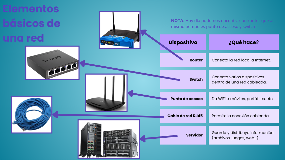 Router | Centro de la red. Conecta todos los dispositivos y da acceso a Internet. | Cable y WiFi |