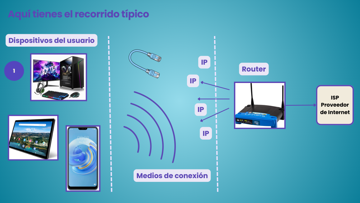 - Dispositivo → Router → ISP → Internet → Servidor.